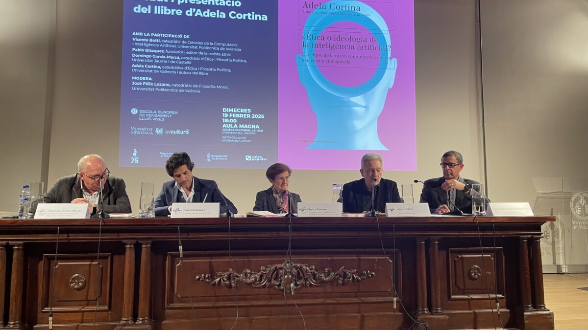 El director de VRAIN de la UPV ha participado en la presentación del libro de la filósofa y Catedrática Emérita de ética y Filosofía Política de la Universitat de València y directora de la Fundación Étnor, Adela Cortina, “¿Ética o ideología de la inteligencia artificial?” que se ha presentado en el centre cultural La Nau. En este acto, además estuvieron presentes el Catedrático de ética y Filosofía Política de la Universitat Jaume I de Castelló, Domingo García-Marzá, y el fundador y editor de la revista Ethic, Pablo Blázquez, junto a la autora del libro y al Catedrático de Filosofía Moral de la Universitat de València, José Félix Lozano, como moderador.